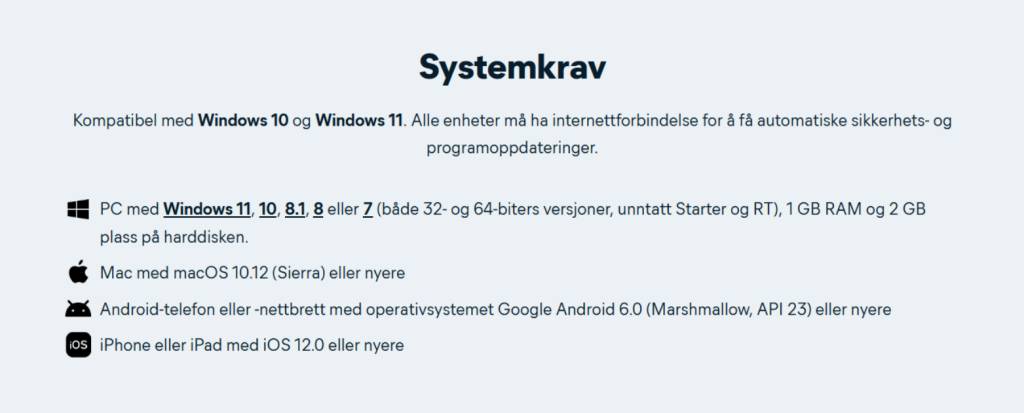 - Windows: Avast Premium Security er kompatibel med Windows 11, 10, 8.1, 8 og 7 (både 32-bit og 64-bit versjoner). Du må også ha minst 1 GB RAM og 2 GB ledig harddiskplass.